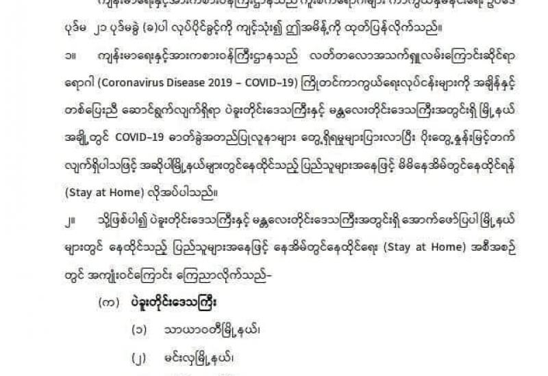 Coronavirus Disease 2019 (COVID-19) ထိန်းချုပ်ရေးနှင့် အရေးပေါ်တုံ့ပြန်ရေးကော်မတီ ပဉ္စမအကြိမ် လုပ်ငန်းညှိနှိုင်းအစည်းအဝေးကို ယနေ့ညနေပိုင်းတွင် နေပြည်တော်ရှိ နိုင်ငံတော် စီမံအုပ်ချုပ်ရေးကောင်စီ ဥက္ကဋ္ဌရုံး အစည်းအဝေးခန်းမ၌ကျင်းပရာ Coronavirus Disease 2019 (COVID-19) ထိန်းချုပ်ရေးနှင့် အရေးပေါ်တုံ့ပြန်ရေးကော်မတီဥက္ကဋ္ဌ ၊ နိုင်ငံတော် စီမံအုပ်ချုပ်ရေး ကောင်စီ ဒုတိယဥက္ကဋ္ဌ၊ ဒုတိယတပ်မတော်ကာကွယ်ရေးဦးစီးချုပ်၊ ကာကွယ်ရေးဦးစီးချုပ် (ကြည်း) ဒုတိယဗိုလ်ချုပ်မှူးကြီး စိုးဝင်း တက်ရောက်အမှာစကား ပြောကြားသည်။