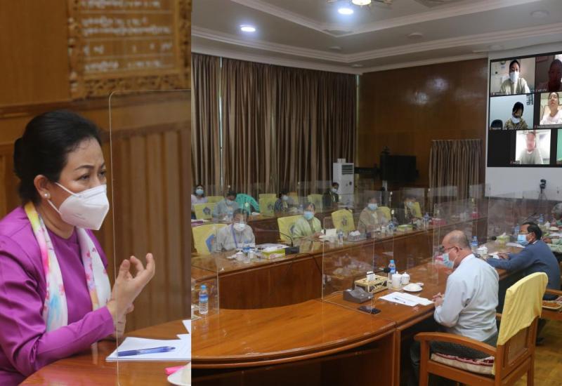ကိုဗစ်-၁၉ ရောဂါ ကာကွယ်ကုသရေးလုပ်ငန်း ညှိနှိုင်းအစည်းအဝေးကို ယနေ့ နံနက် (၁၀) နာရီ တွင် ကျန်းမာရေးနှင့် အားကစားဝန်ကြီးဌာန COVID-19 Command Center ၌ ဗီဒီယို ကွန်ဖရင့်စနစ်ဖြင့် ကျင်းပရာ ကျန်းမာရေးနှင့် အားကစားဝန်ကြီးဌာန ပြည်ထောင်စုဝန်ကြီး ဒေါက်တာသက်ခိုင်ဝင်း တက်ရောက်ဆွေးနွေးသည်။