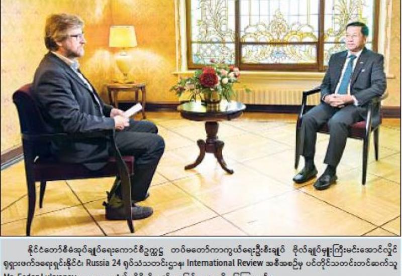 ရုရှားဖက်ဒရေးရှင်းနိုင်ငံသို့ ရောက်ရှိနေသည့် နိုင်ငံတော်စီမံအုပ်ချုပ်ရေးကောင်စီဥက္ကဋ္ဌ တပ်မတော်ကာကွယ်ရေးဦးစီးချုပ် ဗိုလ်ချုပ်မှူးကြီးမင်းအောင်လှိုင်သည် ဇွန် ၂၂ ရက် နံနက်ပိုင်းတွင် ရုရှားဖက်ဒရေးရှင်းနိုင်ငံ၊ Russia 24 ရုပ်သံသတင်းဌာန၊ International Review အစီအစဉ်မှ ပင်တိုင်သတင်း တင်ဆက်သူ Mr.Fedor Lukyanov အား ခေတ္တတည်းခိုလျက်ရှိသည့် Metropol Hotel ၌တွေ့ဆုံ၍ သိရှိလိုသည့် မေးမြန်းမှုများကို လက်ခံဖြေကြားသည်။ အဆိုပါ မေးမြန်းမှုများနှင့် ဖြေကြားမှုများကို ဖော်ပြလိုက်ရပါသည်-