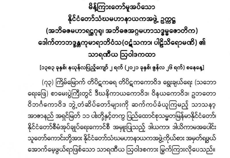 ပြည်ထောင်စုသမ္မတမြန်မာနိုင်ငံတော်၊ သာသနာရေးနှင့် ယဉ်ကျေးမှုဝန်ကြီးဌာနက ကြီးမှူးကျင်းပသည့်(၇၃)ကြိမ်မြောက် တိပိဋကဓရ တိပိဋကကောဝိဒရွေးချယ်ရေး စာမေးပွဲ တွင် သဘောရေးဖြေအောင်မြင်တော်မူကြသော ဒီဃနိကာယကောဝိဒ၊ ဝိနယကောဝိဒနှင့် ဥဘတောဝိဘင်္ဂကောဝိဒ ဘွဲ့တံဆိပ်တော်ရ သာသနာ့အာဇာနည် အရှင်မြတ်များအား ဘွဲ့တံ ဆိပ်တော်နှင့်အောင်လက်မှတ်ဆက်ကပ်ချီးကျူးပူဇော်ပွဲ မဟာမင်္ဂလာ အခမ်းအနားကို ယနေ့ နံနက် ၈ နာရီတွင်ရန်ကုန်တိုင်းဒေသကြီး၊ မရမ်းကုန်း မြို့နယ်၊ ကမ္ဘာအေးကုန်းမြေရှိ မဟာ ပါသာဏလိုဏ်ဂူသိမ်တော်ကြီး၌ ကျင်းပပြု လုပ်သည်။