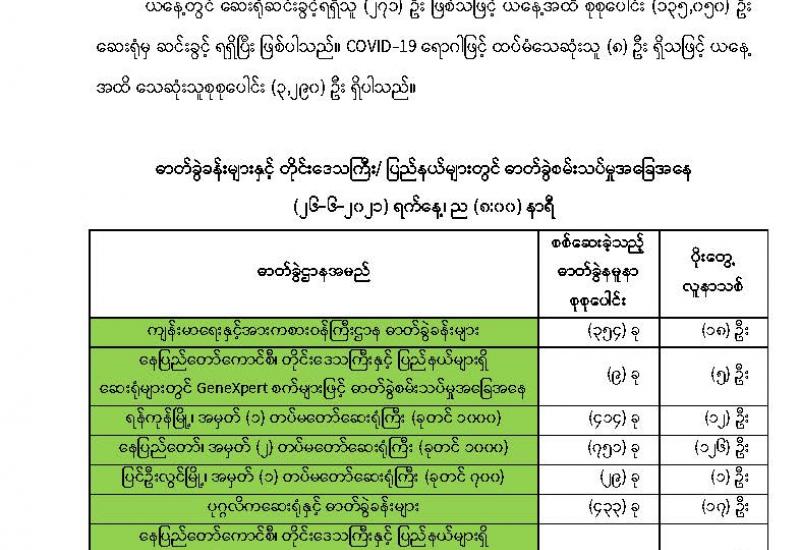 မန္တလေးတိုင်းဒေသကြီး၊ မိတ္ထီလာခရိုင်၊ သာစည်မြို့နယ်ဆေးရုံ၊ ဟံဇားတိုက်နယ် ဆေးရုံ၊ ယင်းမာပင်တိုက်နယ်ဆေးရုံ၊ ညောင်ရမ်းတိုက်နယ်ဆေးရုံ၊ သပိတ်ကျင်းမြို့နယ်၊ တကောင်းတိုက်နယ်ဆေးရုံ၊ ကျောက်ဆည်မြို့နယ်၊ စဉ့်ကိုင်ပြည်သူဆေးရုံ၊ မတ္တရာ မြို့နယ် ပြည်သူ့ဆေးရုံ၊ ပျော်ဘွယ်မြို့နယ်၊ ယင်းတော်တိုက်နယ်ဆေးရုံ၊ ကူမဲတိုက်နယ် ဆေးရုံနှင့် ရွှေညောင်ဖူးတိုက်နယ်ဆေးရုံ၊ ဝမ်းတွင်းမြို့နယ်၊ ပင်းတလဲတိုက်နယ်ဆေးရုံ၊ မြစ်သားမြို့နယ် ပြည်သူ့ဆေးရုံ၊ တောင်သာမြို့နယ်၊ ဝဲလောင်တိုက်နယ်ဆေးရုံ၊ ကျောက်ပန်းတောင်းမြို့နယ် ပြည်သူ့ဆေးရုံနှင့် ညောင်ဦးခရိုင်ပြည်သူ့ဆေးရုံတို့ရှိ ဝန်ထမ်းများနှင့် လူနာရှင်များက အကူအညီတောင်းခံမှုကြောင့် တပ်မတော်မှ ဆေးကုသရေးအဖွဲ့များအား စေလွှတ်၍ ရောဂါဝေဒနာခံစားနေရသည့် ဒေသခံပြည်သူ များကို လိုအပ်သည့်ကျန်းမာရေး စောင့်ရှောက်မှုလုပ်ငန်းများဆောင်ရွက်ပေး လျက်ရှိသည်။ ယနေ့တွင်လည်း ခွဲစိတ် ကုသမှုဆိုင်ရာရောဂါ၊ သွားနှင့်ခံတွင်းရောဂါ၊ အရိုးအကြောရောဂါ၊ အစာအိမ်ရောဂါ၊ မျက်စိရောဂါ၊ နား၊နှာခေါင်း၊ လည်ချောင်း ရောဂါ၊ သားဖွားမီးယပ်ရောဂါ၊ သွေးတိုးရောဂါ၊ နှလုံးရောဂါ၊ အထွေထွေရောဂါတို့နှင့် ပတ်သက်၍ လိုအပ်သည့်ကျန်းမာရေး စစ်ဆေးကုသပေးခြင်းများကို ဆက်လက် ဆောင်ရွက်ပေးပြီး ခွဲစိတ်ကုသရန်လိုအပ်သော လူနာများအားခွဲစိတ်ကုသပေးခြင်း များဆောင်ရွက်ပေးခဲ့ကြောင်း သတင်းရရှိသည်။