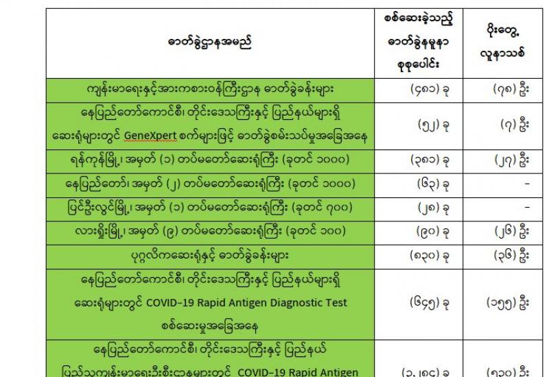 (၂၄-၆-၂၀၂၁) ရက်နေ့၊ ည (၈:၀၀) နာရီမှ (၂၅-၆-၂၀၂၁) ရက်နေ့၊ ည (၈:၀၀) နာရီအတွင်း ဓာတ်ခွဲနမူနာ စုစုပေါင်း (၅,၈၅၄)ခုအား စစ်ဆေးပြီးစီးခဲ့ရာ COVID-19 ရောဂါ ဓာတ်ခွဲအတည်ပြု လူနာသစ် (၈၅၉) ဦး တွေ့ရှိရပါသည်။ သို့ဖြစ်ပါ၍ ယနေ့အထိ ဓာတ်ခွဲနမူနာ စုစုပေါင်း (၂,၇၀၁,၄၀၀) ခု အား စစ်ဆေးခဲ့ပြီး COVID-19 ဓာတ်ခွဲအတည်ပြုလူနာ စုစုပေါင်း (၁၅၁,၅၇၃) ဦး ရှိပြီ ဖြစ်ပါသည်။