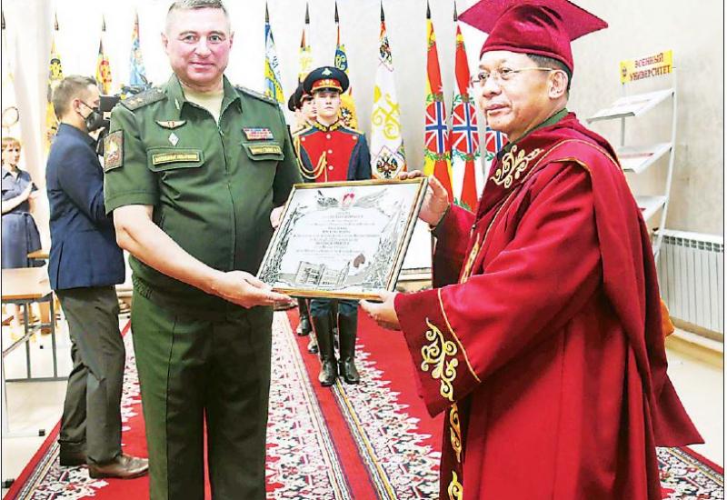 (၉)ကြိမ်မြောက် နိုင်ငံတကာလုံခြုံရေးဆိုင်ရာညီလာခံ (Moscow Conference on International Security-2021(MCIS-2021))သို့ ပါဝင်တက်ရောက်ခဲ့သည့် နိုင်ငံတော် စီမံအုပ်ချုပ်ရေး ကောင်စီဥက္ကဋ္ဌ၊ တပ်မတော်ကာကွယ်ရေးဦးစီးချုပ် ဗိုလ်ချုပ်မှူးကြီး မင်းအောင်လှိုင်အား ရုရှားဖက်ဒရေးရှင်းနိုင်ငံ၊ စစ်ဘက်ဆိုင်ရာ တက္ကသိုလ်မှ “ဂုဏ်ထူး ဆောင်ပါမောက္ခ”ဘွဲ့ပေးအပ်ချီးမြှင့်ခြင်း အခမ်းအနားကို ဇွန် ၂၃ ရက် ညနေပိုင်းတွင် အဆိုပါတက္ကသိုလ်၌ ကျင်းပပြုလုပ်သည်။