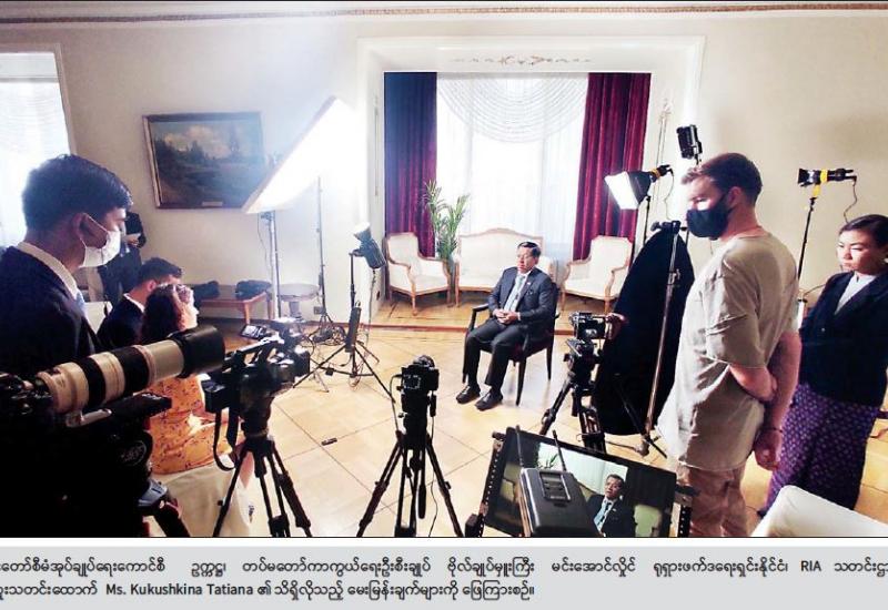 ရုရှားဖက်ဒရေးရှင်းနိုင်ငံ၌ ရောက်ရှိနေသည့် နိုင်ငံတော်စီမံအုပ်ချုပ်ရေးကောင်စီဥက္ကဋ္ဌ၊ တပ်မတော် ကာကွယ်ရေးဦးစီးချုပ် ဗိုလ်ချုပ်မှူးကြီး မင်းအောင်လှိုင် သည် ယနေ့ ဒေသ စံတော်ချိန် နံနက်ပိုင်းတွင် ရုရှားဖက်ဒရေးရှင်းနိုင်ငံ၊ RIA သတင်းဌာနမှ အထူးသတင်းထောက် Ms. Kukushkina Tatiana အား ခေတ္တတည်းခိုလျက်ရှိသည့် Metropol Hotel ၌ လက်ခံတွေ့ဆုံ၍ သိရှိလိုသည်များကို ဖြေကြားသည်။