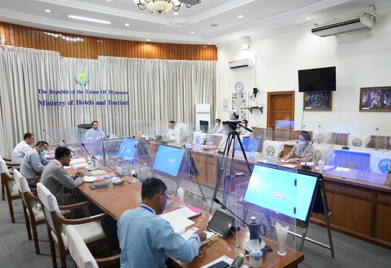 ခရီးသွားလုပ်ငန်း ဖွံ့ဖြိုးတိုးတက်ရေး ဆောင်ရွက်မည့် လုပ်ငန်းစဉ်များနှင့် ပထမအကြိမ် အမျိုး သားခရီးသွားလုပ်ငန်း ဖွံ့ဖြိုးတိုးတက်ရေး ဗဟိုကော်မတီ အစည်းအဝေး ကျင်းပရေးဆိုင်ရာ လုပ်ငန်း ညှိနှိုင်းအစည်းအဝေးကို ယနေ့ နံနက်ပိုင်းတွင် ဟိုတယ်နှင့် ခရီးသွားလာရေးဝန်ကြီး ဌာန ဝန်ကြီးရုံး နီလာခန်းမ၌ ကျင်းပသည်။