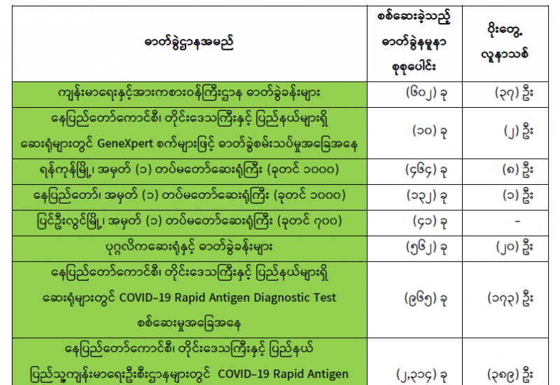 (၂၁-၆-၂၀၂၁) ရက်နေ့၊ ည (၈:၀၀) နာရီမှ (၂၂-၆-၂၀၂၁) ရက်နေ့၊ ည (၈:၀၀) နာရီအတွင်း ဓာတ်ခွဲနမူနာ စုစုပေါင်း (၅,၀၉၀)ခုအား စစ်ဆေးပြီးစီးခဲ့ရာ COVID-19 ရောဂါ ဓာတ်ခွဲအတည်ပြု လူနာသစ် (၆၃၀) ဦး တွေ့ရှိရပါသည်။ သို့ဖြစ်ပါ၍ ယနေ့အထိ ဓာတ်ခွဲနမူနာ စုစုပေါင်း (၂,၆၈၄,၇၅၆) ခု အား စစ်ဆေးခဲ့ပြီး COVID-19 ဓာတ်ခွဲအတည်ပြုလူနာ စုစုပေါင်း (၁၄၉,၂၄၇) ဦး ရှိပြီ ဖြစ်ပါသည်။