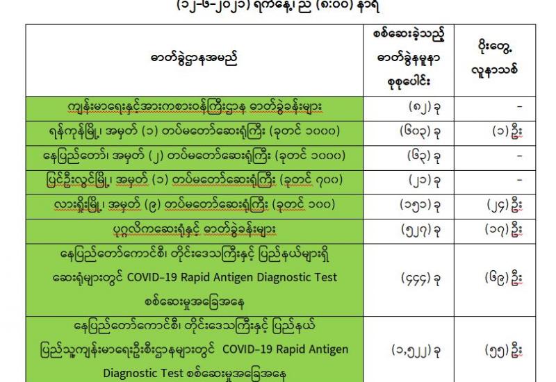 (၁၁-၆-၂၀၂၁) ရက်နေ့၊ ည (၈:၀၀) နာရီမှ (၁၂-၆-၂၀၂၁) ရက်နေ့၊ ည (၈:၀၀) နာရီအတွင်း ဓာတ်ခွဲနမူနာစုစုပေါင်း (၃,၄၁၃) ခုအား စစ်ဆေးပြီးစီးခဲ့ရာ COVID-19 ရောဂါ ဓာတ်ခွဲအတည်ပြု လူနာသစ် (၁၆၆) ဦး တွေ့ရှိရပါသည်။