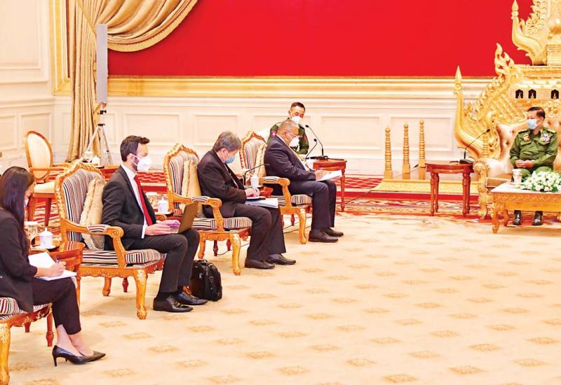 နိုင်ငံတော်စီမံအုပ်ချုပ်ရေးကောင်စီ ဥက္ကဋ္ဌ၊ တပ်မတော်ကာကွယ်ရေးဦးစီးချုပ် ဗိုလ်ချုပ်မှူးကြီး မင်းအောင်လှိုင် သည် ဘရူနိုင်း ဒါရူဆလမ်နိုင်ငံ၊ နိုင်ငံခြားရေးဝန်ကြီး H.E. Dato Erywan Pehin Yusof နှင့် အာဆီယံ အတွင်း ရေးမှူးချုပ် H.E. Dato Lim Jock Hoi တို့အား ယနေ့နံနက်ပိုင်းတွင် နိုင်ငံတော် စီမံအုပ်ချုပ်ရေး ကောင်စီဥက္ကဋ္ဌရုံး သံတမန်ဆောင်၊ ဧည့်ခန်းမ ၌လက်ခံတွေ့ဆုံသည်။