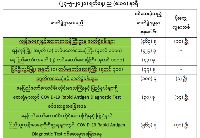 (၂၆-၅-၂၀၂၁) ရက်နေ့၊ ည (၈:၀၀) နာရီမှ (၂၇-၅-၂၀၂၁) ရက်နေ့၊ ည (၈:၀၀) နာရီအတွင်း ဓာတ်ခွဲနမူနာစုစုပေါင်း (၁,၇၈၈) ခုအား စစ်ဆေးပြီးစီးခဲ့ရာ COVID-19 ရောဂါ ဓာတ်ခွဲအတည်ပြု လူနာသစ် (၉၆) ဦး တွေ့ရှိရပါသည်။ သို့ဖြစ်ပါ၍ ယနေ့အထိ ဓာတ်ခွဲနမူနာ စုစုပေါင်း (၂,၆၁၆,၄၆၆) ခု အား စစ်ဆေးခဲ့ပြီး COVID-19 ဓာတ်ခွဲအတည်ပြုလူနာ စုစုပေါင်း (၁၄၃,၄၁၄) ဦး ရှိပြီ ဖြစ်ပါသည်။