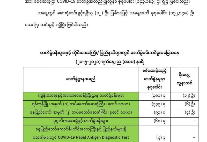 တပ်မတော်အနေဖြင့် ဆောင်ရွက်လျက်ရှိသည့် ပြည်သူ့အကျိုးပြု လုပ်ငန်းများအနက် ပြည်သူလူထုအတွက် အဓိကအကျဆုံးဖြစ်သော ကျန်းမာရေးကဏ္ဍ မြင့်မားရေးအတွက် တပ်မတော်မှပါရဂူများ၊ ဆေးမှူးများ၊ သူနာပြုများဖြင့် နယ်လှည့်ဆေးကုသ ရေးအဖွဲ့များ စုစည်း၍ ဒေသခံပြည်သူလူထုကို ကျန်းမာရေးစစ်ဆေးပေးခြင်း၊ လိုအပ်သည့် ကာကွယ်ဆေး များ ထိုးနှံပေးခြင်း၊ ခွဲစိတ်ရန်လိုအပ် သည့် လူနာများအား ခွဲစိတ်ကုသပေးခြင်း၊ ဆေးရုံ တက်ရောက်ကုသရန် လိုအပ်သော လူနာများကို ဆေးရုံတင်ကာ ကျန်းမာရေး စောင့်ရှောက် ပေးခြင်းများ ဆောင်ရွက်လျက်ရှိသည်။ ၎င်းအပြင် ပြည်သူလူထု၏ အရေးပေါ် ကျန်းမာရေး ဆိုင်ရာကုသမှုများ ဆောင်ရွက်ပေးနိုင်ရန်အတွက် တပ်မတော်ဆေးရုံများနှင့် ယာယီကုသရေး ဆေးရုံများတွင် ကျန်းမာရေး စောင့်ရှောက်မှုများကို နေ့ညမပြတ် ဆောင်ရွက်ပေး လျက်ရှိရာ ဖေဖော်ဝါရီ ၅ ရက်မှ ယနေ့အထိ ပြင်ပလူနာပေါင်း ၂၁၁၁၈၆ ဦးနှင့် အတွင်းလူနာပေါင်း ၆၄၄၃၉ ဦးတို့ကို ကုသပေးနိုင်ခဲ့သည်။