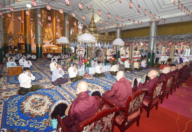၂၀၂၁ ခုနှစ် သာသနာတော်ဆိုင်ရာ ဘွဲ့တံဆိပ်တော်များ ဆက်ကပ်ပူဇော်ပွဲ မဟာမင်္ဂလာ အခမ်းအနားကို ယနေ့မွန်းလွဲပိုင်းတွင် နေပြည်တော် ဥပ္ပါတသန္တိစေတီတော် ပရိဝုဏ်အတွင်းရှိ သာသနာ့မဟာဗိမာန်တော်ကြီး၌ ကျင်းပရာ နိုင်ငံတော်စီမံအုပ်ချုပ်ရေးကောင်စီ ဥက္ကဋ္ဌ၊ တပ်မတော်ကာကွယ်ရေးဦးစီးချုပ် ဗိုလ်ချုပ်မှူးကြီး မင်းအောင်လှိုင်နှင့် ဇနီး ဒေါ်ကြူကြူလှတို့ တက်ရောက်ကြည်ညို၍ သာသနာတော်ဆိုင်ရာ ဘွဲ့တံဆိပ်တော်များ ဆက်ကပ်ပူဇော်ကြသည်။