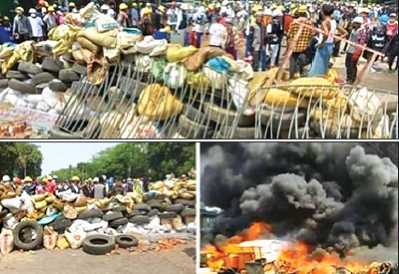 နိုင်ငံတော်ဆန့်ကျင်ရေးကို ဦးတည်ဆောင်ရွက်နေသည့် အဖွဲ့အစည်း များအနေဖြင့် နေရာဒေသအချို့၌ ဥပဒေများအား ချိုးဖောက်ကာ သာမန် လူစုလူဝေးဖြင့် အများပြည်သူ အသုံးပြု သွားလာနေသည့် လမ်းကြောင်း များအား တာယာကွင်းများ အစုအပုံ လိုက်ဖြင့် တားဆီးခြင်း၊ မီးရှို့ခြင်း၊ သစ်ပင်သစ်ကိုင်းများအား ခုတ်လှဲ၍ လမ်းပိတ်ဆို့ခြင်း၊ ကွန်ကရစ်တုံးများ ချထား၍ လမ်းပိတ်ဆို့ခြင်းများပြုလုပ် ခြင်း၊ လုံခြုံရေးတပ်ဖွဲ့ဝင်များအား ဂျင်ကလိ၊ လောက်လေးခွ၊ သံဆူးချွန် များဖြင့် ပစ်ခတ်ခြင်း၊ ဒေသအချို့တွင် တူမီးနှင့် လေသေနတ်များ အသုံးပြု ပစ်ခတ်ခြင်း၊ လုံခြုံရေးတပ်ဖွဲ့ဝင် များအား ဖမ်းဆီးနှိပ်စက်ခြင်း၊ လုံခြုံရေး ကင်မရာ (CCTV) များအား ဖျက်ဆီးခြင်း နှင့် ပြည်သူပိုင်ယာဉ်များအား ဖျက်ဆီး ခြင်း စသည့်လုပ်ငန်းများကို အကြမ်း ဖက်အဖွဲ့အစည်းပုံစံဖြင့် အဖျက် အမှောင့်လုပ်ငန်းများ လုပ်ဆောင် နေကြသည်ကို တွေ့ရှိရကြောင်း မြန်မာနိုင်ငံရဲတပ်ဖွဲ့၏ သတင်း ထုတ်ပြန်ချက်အရ သိရသည်။