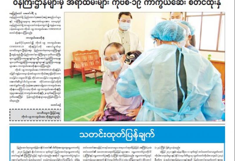 နေပြည်တော်ရှိ ပြည်ထောင်စုအဆင့် အဖွဲ့အစည်းဝင်များနှင့် ဝန်ကြီးဌာနများမှ အရာထမ်းများအား ယနေ့တွင် နေပြည်တော်ရှိ သားဖွား သင်တန်းကျောင်း၌ ကျန်းမာရေး ဝန်ထမ်းများက ကိုဗစ်-၁၉ ကာကွယ်ဆေး (COVISHIELD) စတင်ထိုးနှံပေးကြသည်။