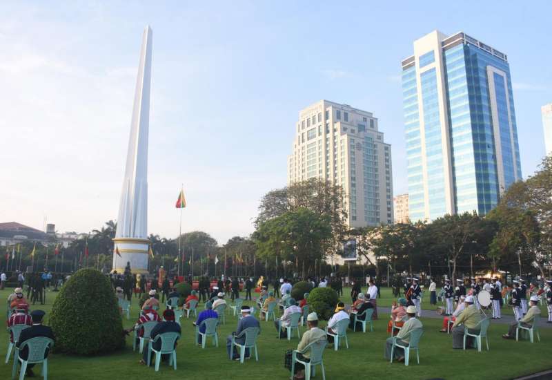 ၂၀၂၁ ခုနှစ် (၇၃) နှစ်မြောက် လွတ်လပ်ရေးနေ့ အလံတင်အခမ်းအနားနှင့် နိုင်ငံ တော်အလံ အလေးပြုခြင်း အခမ်းအနားကို ယနေ့ နံနက်ပိုင်းတွင် ရန်ကုန်မြို့ မဟာဗန္ဓုလ ပန်းခြံရှိ လွတ်လပ်ရေး ကျောက်တိုင်ရှေ့၌ ကိုဗစ်-၁၉ ကာကွယ်၊ ထိန်းချုပ်၊ကုသရေး၊ အမျိုး သားအဆင့် ဗဟိုကော်မတီနှင့် ကျန်းမာရေးနှင့် အားကစား ဝန်ကြီးဌာနတို့က ထုတ်ပြန်ထား သည့်ညွှန်ကြားချက်များနှင့်အညီ ကျင်းပသည်။