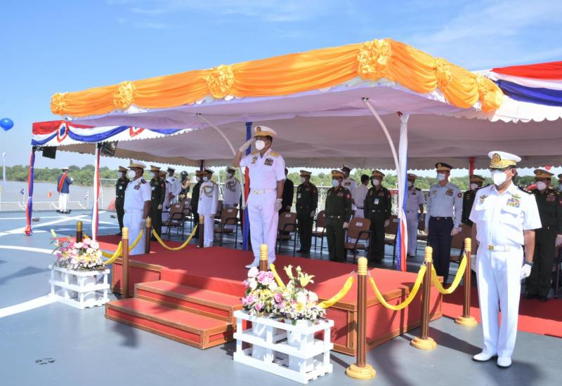 တပ်မတော်(ရေ)၏ (၇၃)နှစ်မြောက် နှစ်ပတ်လည်နေ့တွင် စစ်ရေယာဉ်များတပ်တော်ဝင် ခြင်း အခမ်းအနားကို ရန်ကုန်မြို့ရှိ အမှတ်(၃)ရေတပ်ဆိပ်ခံတံတား၌ ကျင်းပပြုလုပ်ရာ တပ်မတော် ကာကွယ်ရေးဦးစီးချုပ် ဗိုလ်ချုပ်မှူးကြီး မင်းအောင်လှိုင် တက်ရောက်၍ ဂုဏ်ပြု အမှာစကား ပြောကြားသည်။