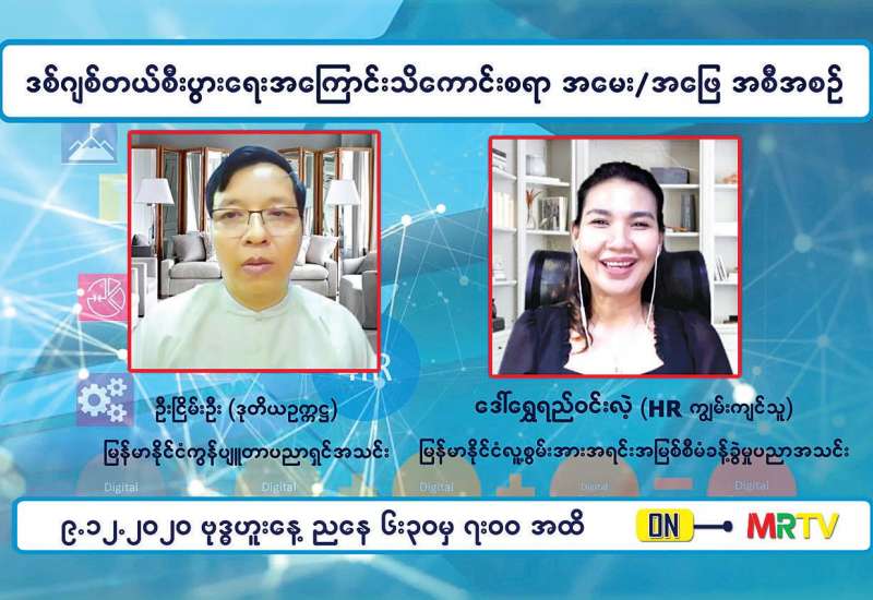 COVID-19 ရောဂါဖြစ်ပွားမှု ကာလအတွင်း စီးပွားရေးလုပ်ငန်းများ ပြန်လည် လုပ်ကိုင်လည်ပတ်နိုင်ရန် ရည်ရွယ်ချက်ဖြင့် ပြည်သူကို ပညာပေးမျှဝေပေးမည့် “ဒစ်ဂျစ်တယ်စီးပွားရေးအကြောင်းသိကောင်းစရာ အမေး/အဖြေ အစီအစဉ်” ကို နိုဝင်ဘာ၂၅ရက်မှစ၍ အပတ်စဉ်ဗုဒ္ဓဟူးနှင့် ကြာသပတေးနေ့များတွင် ညနေ ၆ နာရီ မိနစ် ၃၀ မှ ည ၇ နာရီအထိ မြန်မာ့အသံနှင့် ရုပ်မြင်သံကြားတွင် ထုတ်လွှင့်ပြသလျက်ရှိသည်။