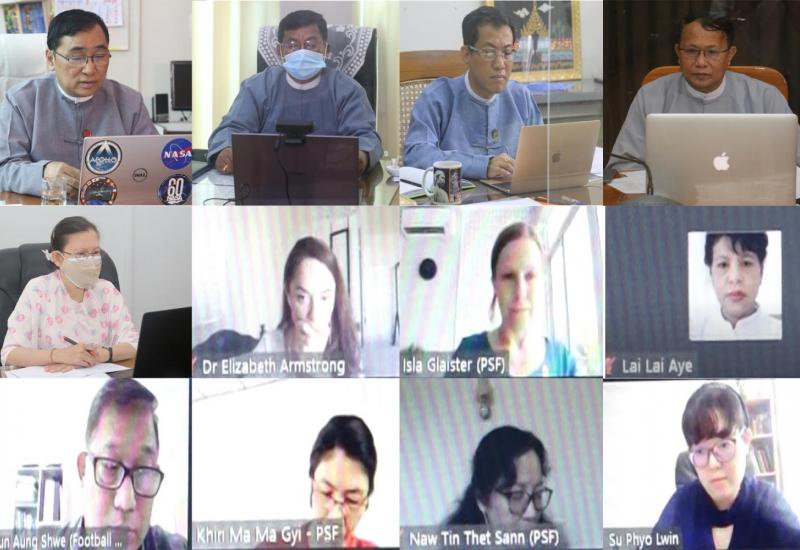 လူမှုသဟဇာတဆိုင်ရာ လုပ်ငန်းများ ဆက်လက်ဆောင်ရွက်နိုင်ရန် လူမှုသဟဇာsတဆိုင် ရာ မူဘောင်တစ်ရပ် ပေါ်ပေါက်လာရေးဆွေးနွေးပွဲကို ယနေ့နံနက်ပိုင်းက လူမှုဝန်ထမ်း ၊ကယ် ဆည်ရေးနှင့် ပြန်လည်နေရာ ချထားရေးဝန်ကြီးဌာန ပြည်ထောင်စုဝန်ကြီးဒေါက်တာဝင်းမြတ် အေးနှင့် ဝန်ကြီးဌာန တာဝန်ရှိ သူများ၊ Paung Sie Facility နှင့် ဩစတြေးလျနိုင်ငံ Football United အဖွဲ့တို့ အွန်လိုင်းစနစ်ဖြင့်ကျင်းပပြုလုပ်သည်။
