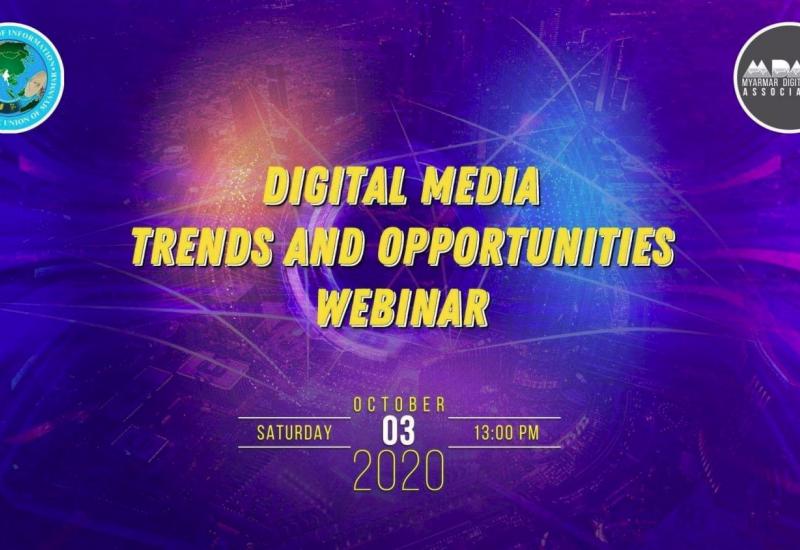 မြန်မာနိုင်ငံ ဒီဂျစ်တယ် မီဒီယာအသင်းဖြစ်မြောက်ရေး ကော်မတီက စီစဉ်ကျင်းပသည့် Digital Media Trends and Opportunities Webinar ကို ၂၀၂၀ ပြည့်နှစ် အောက်တိုဘာ ၃ ရက် မွန်းလွဲ (၁) နာရီအချိန်တွင် ကျင်းပပြုလုပ်မည်ဖြစ်ပြီး Digital Media Guide to Work-From-Home ခေါင်းစဉ်နှင့် Digital Media Monetisation Opportunities & Challenges ခေါင်းစဉ် များဖြင့် ဆွေးနွေးမည် ဖြစ်ပါသည်။