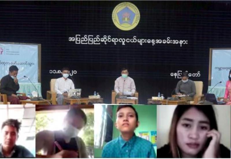 ကိုဗစ်-၁၉ ကပ်ရောဂါကာလအတွင်း အခြေခံပညာအထက်တန်းဆင့်ကျောင်းများ ပြန်လည်ဖွင့်လှစ်နိုင်ရေး ညှိနှိုင်းအစည်းအဝေးကို ယနေ့မွန်းလွဲ ၃ နာရီတွင် ပညာရေးဝန်ကြီးဌာန အစည်းအဝေးခန်းမ၌ Video Conferencing စနစ်ဖြင့် ကျင်းပသည်။