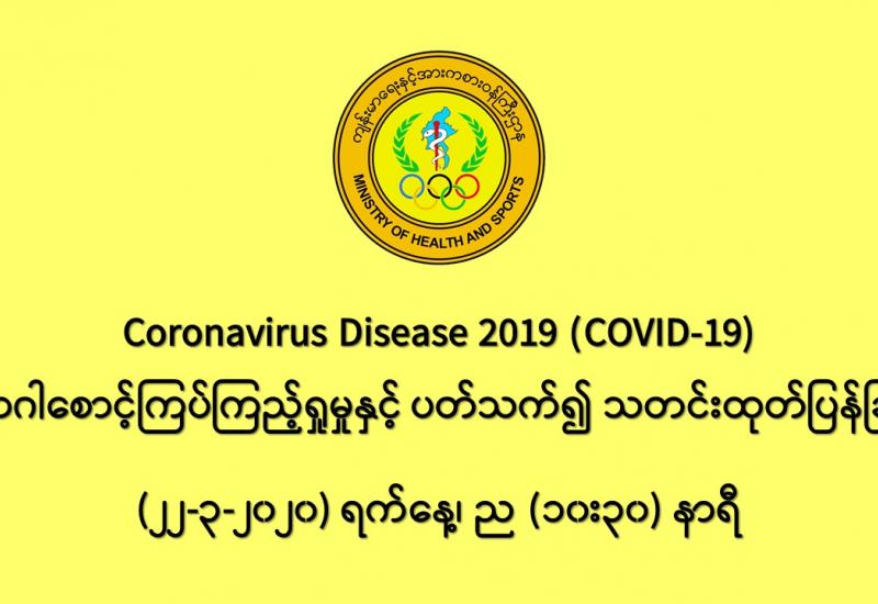 ၁။ ကျန်းမာရေးနှင့် အားကစားဝန်ကြီးဌာနသည် ကမ္ဘာ့နိုင်ငံများတွင် ကူးစက်ပျံ့နှံ့လျက်ရှိသည့် COVID-19 လတ်တလော အသက်ရှူလမ်းကြောင်းဆိုင်ရာ ရောဂါဖြစ်ပွားမှုဖြစ်စဉ်နှင့် ပတ်သက်၍ ရောဂါစောင့်ကြပ်ကြည့်ရှုခြင်းလုပ်ငန်းများအား အပြည်ပြည်ဆိုင်ရာ ဝင်ပေါက်၊ ထွက်ပေါက် ဂိတ်များတွင်လည်းကောင်း၊ ဆေးရုံအခြေပြု အဖြစ်လည်းကောင်း၊ ပြည်သူလူထု အခြေပြု စောင့်ကြပ်ကြည့်ရှုခြင်း လုပ်ငန်းများဖြင့်လည်းကောင်း၊ ပုဂ္ဂလိကဆေးရုံများနှင့် ပူးပေါင်း၍လည်းကောင်း ဆောင်ရွက်လျက် ရှိပါသည်။