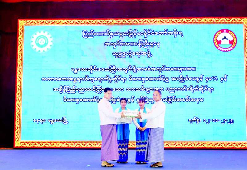 မန္တလေးတိုင်းဒေသကြီးအတွင်းရှိ အာမခံအလုပ်သမားများအား သဘာဝဘေးအန္တရာယ်ကျရောက်မှုဆိုင်ရာ မိသားစုထောက်ပံ့မှုအကျိုးခံစားခွင့်နှင့် သားသမီးများအား ပညာသင်စရိတ်ဆိုင်ရာ မိသားစုထောက်ပံ့မှု အကျိုးခံစားခွင့်ပေးအပ်ခြင်းကို ယနေ့နံနက်ပိုင်းတွင် မန္တလေးမြို့တော်ခန်းမ၌ ကျင်းပသည်။
