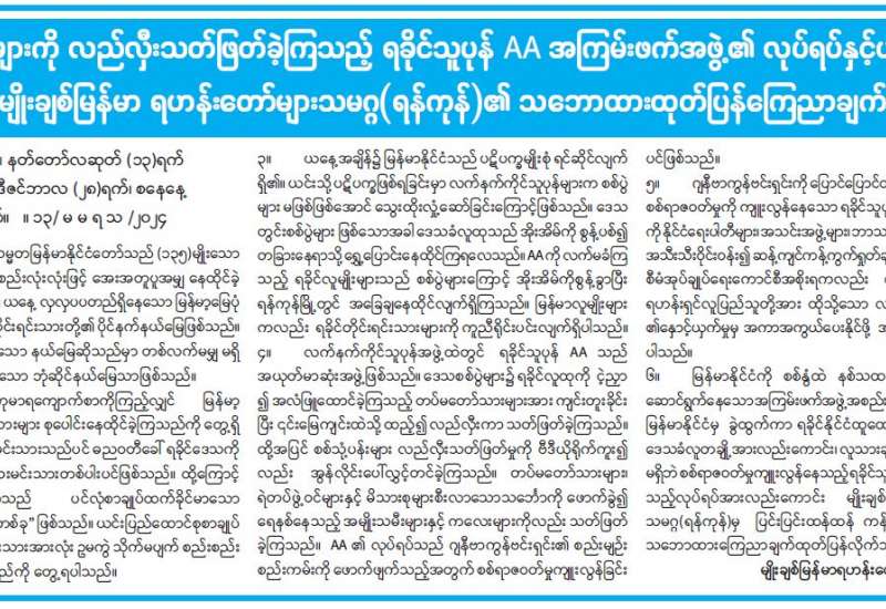 ရခိုင်ပြည်နယ်အတွင်း ဖြစ်ပွားလျက်ရှိသော တိုက်ပွဲဖြစ်စဉ်များ၌ ဒေသခံပြည်သူများ၏ အသက်အန္တရာယ်ကိုငဲ့ညှာ၍ ပြန်လည်ပစ်ခတ်တိုက်ခိုက်မှုအား ထိန်းသိမ်းဆောင်ရွက်ခဲ့ရသဖြင့် ဖမ်းဆီးခြင်းခံခဲ့ရသည့် တပ်မတော်သားများအား AA အကြမ်းဖက်သောင်းကျန်းသူများက ကျင်းတူးခိုင်းပြီး မြေကျင်းထဲသို့ထည့်၍ လည်လှီးကာသတ်ဖြတ်ခြင်း၊ အဆိုပါလည်လှီးသတ်ဖြတ်နေသည့် Video File များကို ရိုက်ကူး၍ Online ပေါ်တွင် ဖြန့်ဝေခြင်း ပြုလုပ်လျက်ရှိသည်။ ထို့ပြင် ကျောက်တော်နယ်မြေ၌လည်း တပ်မတော်သားများ ရဲတပ်ဖွဲ့ဝင်များနှင့် မိသားစုများလိုက်ပါလာသော သင်္ဘောကိုလည်း ပစ်ခတ်ဖောက်ခွဲ၍ ရေနစ်နေသည့် အမျိုးသမီးများနှင့် ကလေးငယ်များကိုလည်း ရက်ရက်စက်စက် သတ်ဖြတ်ခဲ့ကြသည်။