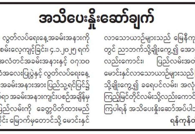 ယနေ့သည် ကမ္ဘာသုံးပြက္ခဒိန်နှစ်တစ်နှစ်၏ နောက်ဆုံးနေ့ဖြစ်၍ ညဉ့်လယ်သန်းခေါင်ယံ၏ ဟိုမှာဘက်တွင် နှစ်သစ်တစ်ခုစဦးတော့မည်ဖြစ်သည်။ အနာဂတ်ဆီသို့ တစ်သမတ်တည်းစီးဆင်းနေသည့် အချိန်စီးကြောင်းကြီးကို စက္ကန့်၊ မိနစ်၊ နာရီ၊ ရက်၊ လတို့ ပိုင်းခြားသတ်မှတ်ကာ လူရေး လူမှု လူ့ကိစ္စတို့အတွက် အမှတ်အသားပြုသုံးစွဲနေကြသည့်တိုင် လူတစ်ဦးချင်းစီအတွက် ကိုယ်ပိုင်အချိန်မှာ မွေးသည်မှ သေသည်အထိဖြစ်သော ဘဝဖြစ်တည်ချိန်၊ ရှင်သန်ချိန်သာလျှင်ဖြစ်သည်။ ဗုဒ္ဓ၏တရားတော်အရဆိုလျှင် ပစ္စုပ္ပန်၏ အခိုက်အတန့်ကလေးများသည်သာ ကောင်းမှု၊ မကောင်းမှုတို့ကို ဆောင်ရွက်နိုင်သည့် ကိုယ်ပိုင်အချိန်ကလေးများဖြစ်ပြီး ပြီးဆုံးသွားသည့်အတိတ်နှင့် ရောက်မလာသေးသည့် အနာဂတ်တို့မှာ မိမိတို့မပိုင်။