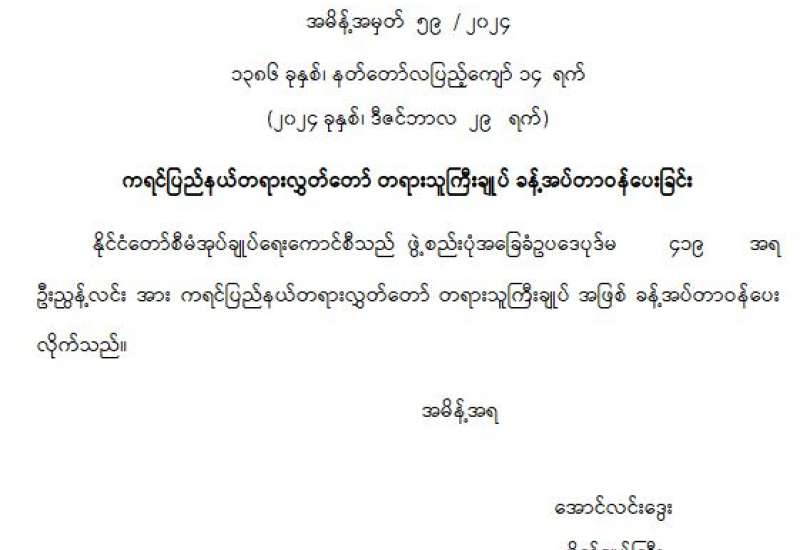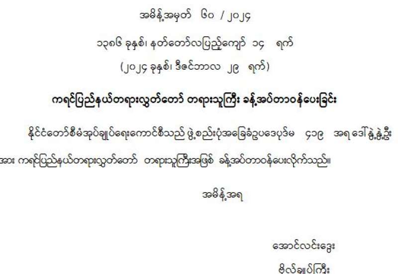 ကရင်ပြည်နယ်တရားလွှတ်တော် တရားသူကြီး ခန့်အပ်တာဝန်ပေးခြင်း