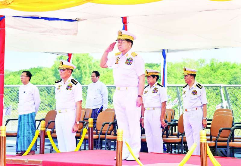 ပြည်ထောင်စုသမ္မတမြန်မာနိုင်ငံတော်၊ တပ်မတော်(ရေ)၏ (၇၇)နှစ်မြောက် တပ်မတော်(ရေ) နှစ်ပတ်လည်နေ့တွင် နိုင်ငံတော်၏ရေကြောင်းဆိုင်ရာအကျိုးစီးပွားများနှင့် မြန်မာ့ပင်လယ်ပြင် သီးသန့်စီးပွားရေးဇုန်အား အပြည့်အဝကာကွယ်စောင့် ရှောက်နိုင်ရန်အတွက် စစ်ရေယာဉ်များ တပ်တော်ဝင်ခြင်းအခမ်းအနားကို ရန်ကုန်မြို့ရှိ အမှတ်(၃)ရေတပ်ဆိပ်ခံတံတား၌ကျင်းပပြုလုပ်ရာ နိုင်ငံတော်စီမံအုပ်ချုပ်ရေးကောင်စီဥက္ကဋ္ဌ တပ်မတော်ကာကွယ်ရေးဦးစီးချုပ် ဗိုလ်ချုပ်မှူးကြီး မင်းအောင်လှိုင် တက်ရောက်ဂုဏ်ပြုချီးမြှင့်သည်။