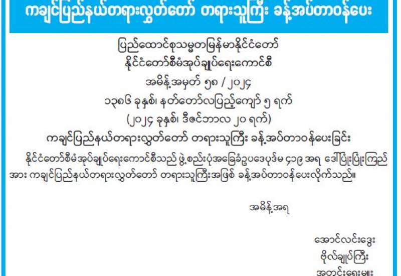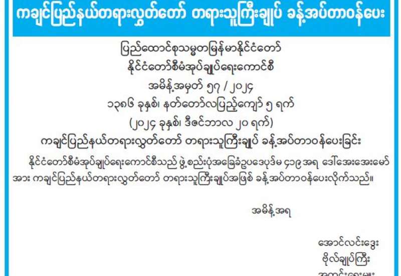 ကချင်ပြည်နယ်တရားလွှတ်တော် တရားသူကြီး ခန့်အပ်တာဝန်ပေး