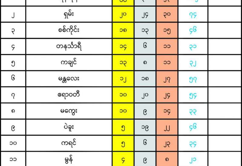 ၂၀၂၄ ခုနှစ် ပဉ္စမအကြိမ် အမျိုးသားအားကစားပွဲတော် ပြည်နယ်နှင့် တိုင်းဒေသကြီးအဆင့် အားကစားပြိုင်ပွဲအလိုက် အသင်းလိုက် ရွှေ၊ ငွေ၊ ကြေး ဆုရရှိမှု ( ၁၁-၁၂-၂၀၂၄ မှ ၁၅-၁၂-၂၀၂၄) ရက်နေ့ထိ