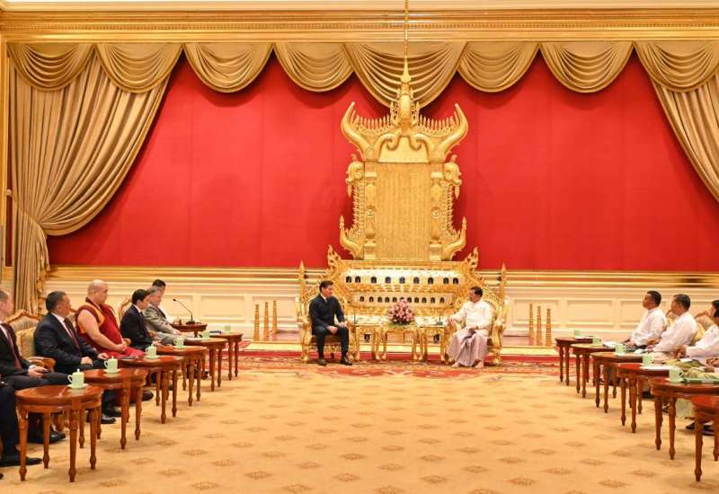 နိုင်ငံတော်စီမံအုပ်ချုပ်ရေးကောင်စီဥက္ကဋ္ဌ နိုင်ငံတော်ဝန်ကြီးချုပ် ဗိုလ်ချုပ်မှူးကြီးမင်းအောင်လှိုင်သည် ရုရှားဖက်ဒရေးရှင်းနိုင်ငံ၊ ကာလ်မီးကီယာပြည်နယ်အကြီးအကဲ H.E. Mr. Batu KHASIKOV ဦးဆောင်သော ကိုယ်စားလှယ်အဖွဲ့အား ယနေ့နံနက်ပိုင်းတွင် နေပြည်တော်ရှိ နိုင်ငံတော်စီမံအုပ်ချုပ်ရေးကောင်စီဥက္ကဋ္ဌရုံး သံတမန်ဆောင်ဧည့်ခန်းမ၌ လက်ခံတွေ့ဆုံသည်။