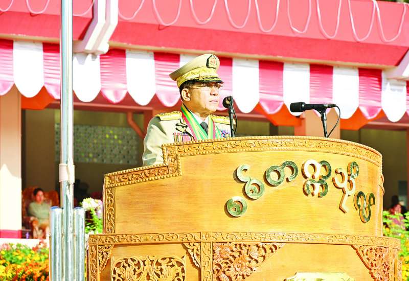 စစ်တက္ကသိုလ် ဗိုလ်လောင်းသင်တန်းအမှတ်စဉ်(၆၆) သင်တန်းဆင်းဂုဏ်ပြု စစ်ရေးပြအခမ်းအနားကို ယနေ့နံနက်ပိုင်းတွင် ပြင်ဦးလွင်မြို့၊ စစ်တက္ကသိုလ်စစ်ရေးပြကွင်း၌ ကျင်းပပြုလုပ်ရာ နိုင်ငံတော်စီမံအုပ်ချုပ်ရေးကောင်စီဥက္ကဋ္ဌ တပ်မတော်ကာကွယ်ရေးဦးစီးချုပ် ဗိုလ်ချုပ်မှူးကြီး သတိုးမဟာသရေစည်သူ သတိုးသီရိသုဓမ္မ မင်းအောင်လှိုင် တက်ရောက်မိန့်ခွန်း ပြောကြားသည်။