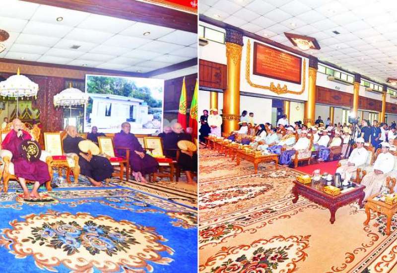 (၁၀၄)နှစ်မြောက် အမျိုးသားအောင်ပွဲနေ့နှင့် ဘွဲ့တံဆိပ်တော်ဆက်ကပ်ချီးမြှင့်ခြင်း မင်္ဂလာအခမ်းအနားကို ယနေ့မွန်းလွဲပိုင်းတွင် ရန်ကုန်မြို့ရွှေတိဂုံစေတီတော် တောင်ဘက်မုခ်အနီးရှိ တပ်မတော်ဓမ္မာရုံ၌ ကျင်းပသည်။