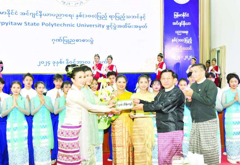 မြန်မာနိုင်ငံ အင်ဂျင်နီယာပညာရေးနှစ်(၁၀၀)ပြည့် ရာပြည့်သဘင်နှင့် Naypyitaw State Polytechnic University ဖွင့်ပွဲအထိမ်းအမှတ် ဂုဏ်ပြုညစာစားပွဲအခမ်းအနားကို ယနေ့ညနေပိုင်းတွင် အဆိုပါတက္ကသိုလ်၌ကျင်းပပြုလုပ်ရာ နိုင်ငံတော်စီမံအုပ်ချုပ်ရေးကောင်စီဥက္ကဋ္ဌ နိုင်ငံတော်ဝန်ကြီးချုပ် ဗိုလ်ချုပ်မှူးကြီးမင်းအောင်လှိုင် တက်ရောက်ချီးမြှင့်သည်။