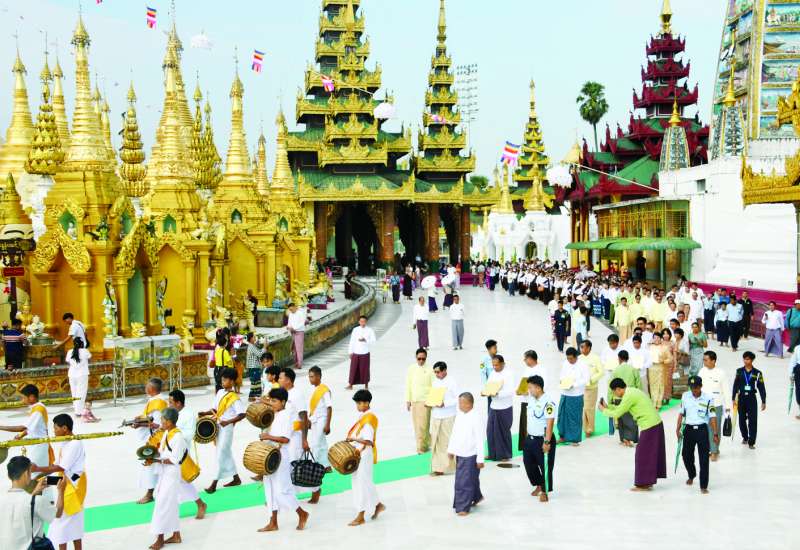 ရွှေတိဂုံစေတီတော်မြတ်ကြီးအား လုံးတော်ပြည့်ရွှေစင်ရွှေပြားသင်္ကန်းတော်များ စတင်ကပ်လှူပူဇော်ခြင်းနှင့် ရွှေပြားသင်္ကန်းတော်များ လှည့်လည်ပူဇော်ပွဲကို ယနေ့နံနက်ပိုင်းတွင် စေတီတော်ရင်ပြင်ရှိ သတ်မှတ်နေရာများ၌ ကျင်းပသည်။