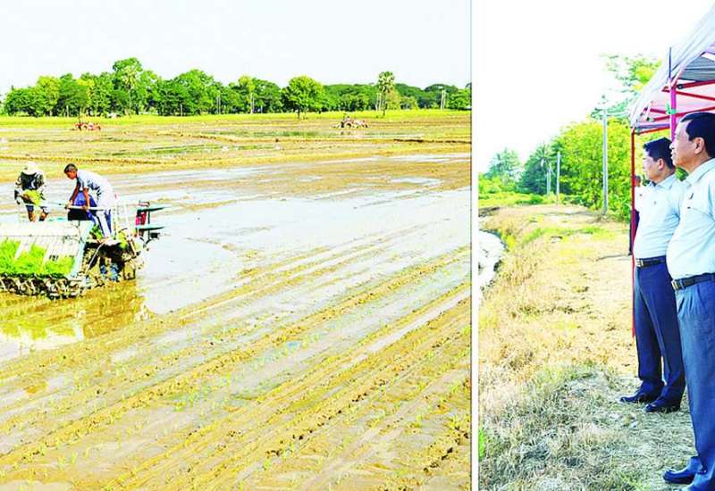 နေပြည်တော်ကောင်စီနယ်မြေအတွင်း ရေကြီးနစ်မြုပ်မှုကြောင့် ထိခိုက်ပျက်စီးခဲ့သော သီးနှံစိုက်ခင်းများ ပြန်လည်စိုက်ပျိုးနိုင်ရေးအတွက် ပြည်ထောင်စုဝန်ကြီး ဦးမင်းနောင်၊ နေပြည်တော်ကောင်စီဥက္ကဋ္ဌ ဦးသန်းထွန်းဦးနှင့် ဒုတိယဝန်ကြီးများ၊ နေပြည်တော်ကောင်စီဝင်များ၊ တာဝန်ရှိသူများသည် ယနေ့နံနက်ပိုင်းတွင် ဇေယျာသီရိမြို့နယ် စိမ်းစားပင်ကျေးရွာအနီးရှိလယ်မြေ ၂၁ ဧကကို စက်မှုလယ်ယာဦးစီးဌာနက မြေပြင်ထွန်ယက်ပေးနေမှု၊ ကောက်စိုက်စက်များဖြင့် မိုးစပါးစိုက်ပျိုး နေမှုကို ကြည့်ရှုအားပေးကြသည်။