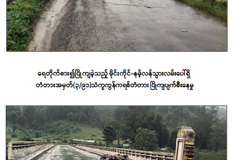 ရှမ်းပြည်နယ်(တောင်ပိုင်း)၊ လွိုင်လင်ခရိုင်၊ မိုင်းကိုင်မြို့တွင် ယနေ့နံနက်ပိုင်းက မိုးသည်းထန်စွာရွာသွန်းမှုကြောင့် နန်းလုံချောင်းရေမြင့်တက်လာပြီး မိုင်းကိုင်- နမ့်လန်သွားလမ်းပေါ်ရှိ တံတားအမှတ်(၃/၉၁)၊ အလျား ၃၆၀ ပေ၊ အကျယ် ၃၀ ပေ၊ ခံနိုင်ဝန် ၆၀ တန်ရှိ ဆားတောသံကူကွန်ကရစ်တံတားသည် မွန်းလွဲ ၂ နာရီခန့်တွင် တံတား၏ မြောက်ဘက်ခြမ်းရှိ ချဉ်းကပ်လမ်းအကျယ် ၃၀ ပေ၊ အလျား ၃၀ ပေ ရေတိုက်စား၍ ပြိုကျပျက်စီးခဲ့ပြီး ယာဉ်ကြီး/ယာဉ်ငယ်များ ဖြတ်သန်းသွားလာမှုရပ်တန့်ခဲ့ရကြောင်း သိရှိရသည်။