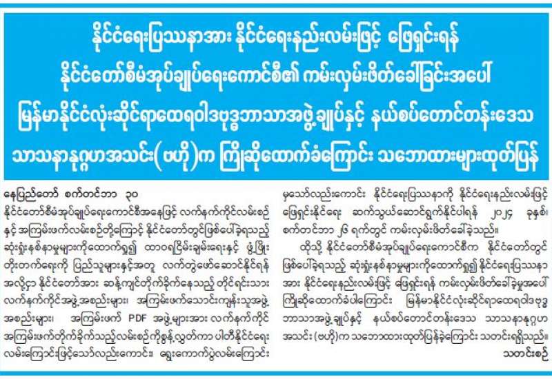 ယနေ့သည် နိုင်ငံတစ်ဝန်းလုံးရှိ နိုင်ငံသူနိုင်ငံသား တိုင်းရင်းသားညီအစ်ကိုမောင်နှမများအားလုံး အတူတကွပူးပေါင်းပြီး ညီညွတ်သောအင်အားကို စတင်ထုတ်ဖော်ပြသည့်နေ့ဖြစ်သည်။ ပြည်ထောင်စုမြန်မာနိုင်ငံတော်အတွင်း အမှန်တည်ရှိနေသော လူဦးရေနှင့်အိမ်အကြောင်းအရာ ကိန်းဂဏန်းအချက်အလက်များကို အောက်တိုဘာလ ၁ ရက်နေ့ (ယနေ့) မှ ၁၅ ရက်နေ့အထိ ပြည်လုံးကျွတ်သန်းခေါင်စာရင်း ကွင်းဆင်းကောက်ယူနေကြပြီဖြစ်သည်။ တစ်မျိုးသားလုံး တစ်ချိန်တည်းတစ်ပြိုင်တည်း တက်ညီလက်ညီဆောင်ရွက်ကြသည့် အမျိုးသားရေးလုပ်ငန်းစဉ်ကြီး အောင်မြင်ရေးအတွက် ဝိုင်းဝန်းပူးပေါင်းဆောင်ရွက်ကြရမည်ဖြစ်သည်။