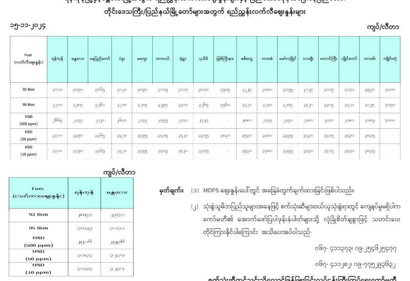 ရန်ကုန်မြို့နှင့် မန္တလေးမြို့အတွက် ရည်ညွှန်းလက်ကားဈေးနှုန်းများနှင့် ပြည်ထောင်စုနယ်မြေ နေပြည်တော်၊ တိုင်းဒေသကြီး/ပြည်နယ် မြို့တော်များအတွက် ရည်ညွှန်းလက်လီဈေးနှုန်းများ