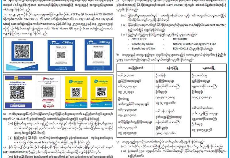 ပဲခူးတိုင်းဒေသကြီး၊ တောင်ငူခရိုင်သဘာဝဘေးအန္တရာယ်ဆိုင်ရာစီမံကွပ်ကဲမှုရုံးနှင့် ရေဘေးရှောင်စခန်းများသို့ အနုပညာရှင်များ၊ ပရဟိတအသင်းအဖွဲ့များနှင့် အလှူရှင်များက ဆန်၊ ဆီ၊ ကြက်ဥ၊ ခေါက်ဆွဲခြောက်၊ သောက်ရေသန့်၊ လူသုံးကုန်ပစ္စည်းများနှင့် စားသောက်ဖွယ်ရာများ လာရောက်လှူဒါန်းသည်။
