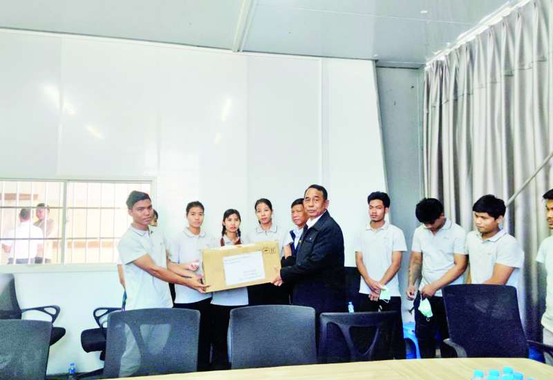 အလုပ်သမားဝန်ကြီးဌာန ပြည်ထောင်စုဝန်ကြီး ဦးမြင့်နောင်နှင့် မြန်မာကိုယ်စားလှယ်အဖွဲ့သည် လာအိုနိုင်ငံဆိုင်ရာ မြန်မာသံအမတ်ကြီး ဦးအောင်ကို၊ လာအိုနိုင်ငံ အလုပ်သမားနှင့်လူမှုဝန်ထမ်းဝန်ကြီးဌာန ဒုတိယဝန်ကြီး Mr. H.E. Phongxaysack INTHALATH နှင့်အတူ ယနေ့နံနက်ပိုင်းတွင် ဗီယင်ကျန်းမြို့ Saysetha Development Zone ရှိ Best Garment (Laos) စက်ရုံနှင့် Honor Home (Laos) Sole Limited စက်ရုံများသို့သွားရောက်၍ မြန်မာရွှေ့ပြောင်း အလုပ်သမားများကို တွေ့ဆုံအားပေးသည်။