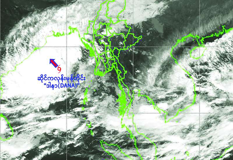 ယနေ့ညနေ ၅ နာရီခွဲ တိုင်းထွာချက်များအရ ဘင်္ဂလားပင်လယ်အော် အရှေ့အလယ်ပိုင်းတွင် ဖြစ်ပေါ်နေသော ဆိုင်ကလုန်းမုန်တိုင်း “ဒါနာ” သည် အနောက်မြောက်ဘက်သို့ ရွေ့လျားခဲ့ပြီး မြန်မာနိုင်ငံဂွမြို့၏ အနောက်ဘက်ရေမိုင် ၃၂၅ မိုင်ခန့်၊ အိန္ဒိယနိုင်ငံ အနောက်ဘင်္ဂလားပြည်နယ် ဆာဂါကျွန်း၏ တောင်-အရှေ့တောင်ဘက် ရေမိုင် ၂၉၅ မိုင်ခန့်အကွာ ပင်လယ်ပြင်ကို ဗဟိုပြုနေသည်။ ဗဟိုချက်လေဖိအား ၉၉၈ ဟက်တိုပါစကယ်နှင့် အမြင့်ဆုံးလေတိုက်နှုန်းမှာ တစ်နာရီလျှင် မိုင် ၄၀ မှ ၄၅ မိုင်နှုန်းခန့်ဖြစ်သည်။