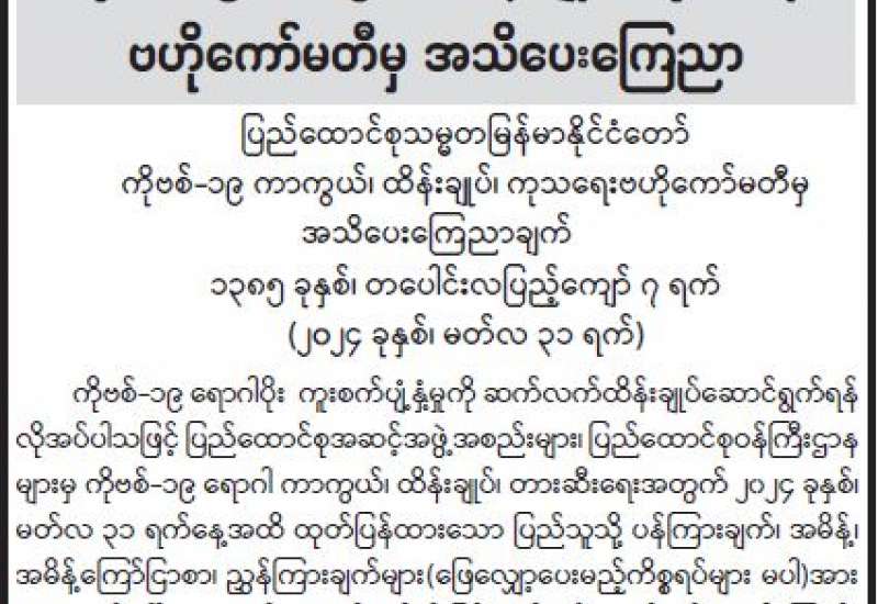 ကိုဗစ်-၁၉ ကာကွယ်၊ ထိန်းချုပ်၊ ကုသရေးဗဟိုကော်မတီမှ အသိပေးကြေညာ