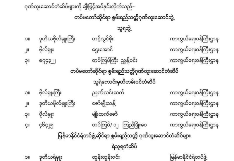 (၇၉) နှစ်မြောက် တပ်မတော်နေ့ဂုဏ်ပြုဇာတ်လမ်းဖြစ်သည့် “တွဲလက်တူစုံ ချစ်ရိပ်မြုံ” ဇာတ်လမ်းတွင် ပါဝင်သရုပ်ဆောင်ခဲ့ကြသည့် အနုပညာရှင်များနှင့် ဂုဏ်ပြုစစ်ချီသီချင်း၊ စစ်သည်တေးသီချင်း၊ ကဗျာနှင့်ဝတ္ထုစာမူဆုရရှိသူ စာပေပညာရှင်များအား ဂုဏ်ပြုဆုနှင့် ဂုဏ်ပြုမှတ်တမ်းလွှာများပေးအပ်ပွဲကို ယနေ့ညနေပိုင်းတွင် နေပြည်တော်ရှိ ဘုရင့်နောင်ရိပ်သာ ဧည့်ခန်းမဆောင်၌ ကျင်းပပြုလုပ်ရာ ညှိနှိုင်းကွပ်ကဲရေးမှူး (ကြည်း၊ ရေ၊ လေ) ဗိုလ်ချုပ်ကြီး မောင်မောင်အေး၊ ကာကွယ်ရေးဦးစီးချုပ်ရုံးမှ တပ်မတော်အရာရှိကြီးများ၊ နေပြည်တော် တိုင်းစစ်ဌာနချုပ် တိုင်းမှူးနှင့် တာဝန်ရှိသူများ၊ ဖိတ်ကြားထားသူများ တက်ရောက်ကြသည်။