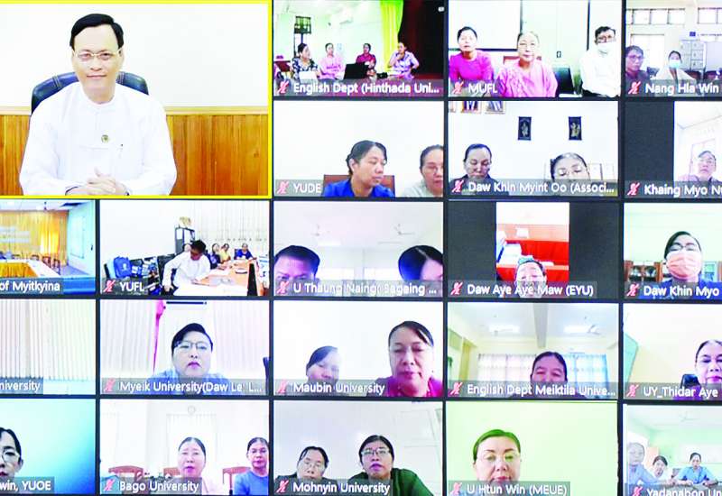 ပညာရေးဝန်ကြီးဌာန ဒုတိယဝန်ကြီး ဒေါက်တာဇော်မြင့်သည် ယနေ့နံနက် ၁၀ နာရီတွင် တက္ကသိုလ်အသီးသီးမှ အင်္ဂလိပ်စာပါမောက္ခ၊ တွဲဖက်ပါမောက္ခများနှင့် အွန်လိုင်းမှတွေ့ဆုံကာ ရန်ကုန်တက္ကသိုလ်၊ မန္တလေးတက္ကသိုလ်တို့အပြင် မြစ်ကြီးနား၊ တောင်ကြီး၊ မော်လမြိုင်၊ ပုသိမ်၊ မကွေးတက္ကသိုလ်တို့တွင် အင်္ဂလိပ်စာအထူးပြု ပါရဂူတန်းများ တိုးချဲ့ဖွင့်လှစ်ရေးကိစ္စ ညှိနှိုင်းဆွေးနွေးသည်။