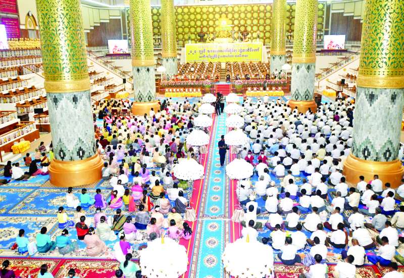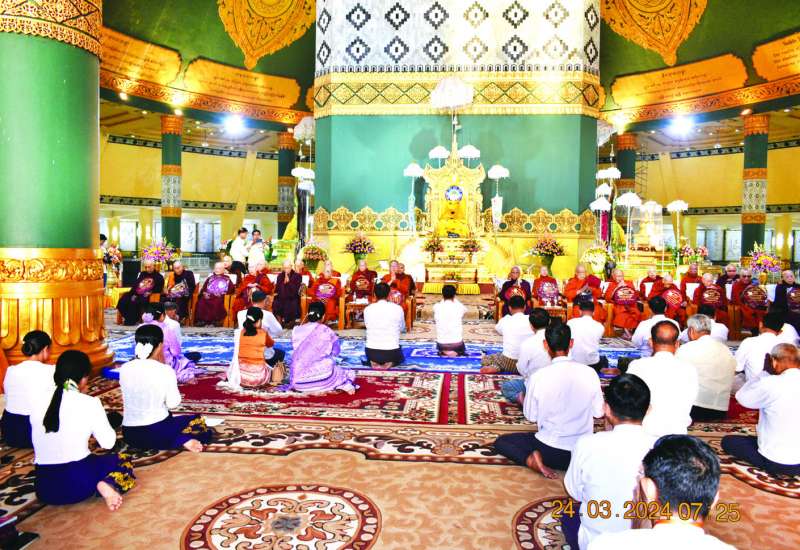 ၂၀၂၄ ခုနှစ် သာသနာတော်ဆိုင်ရာ ဘွဲ့တံဆိပ်တော်များ ဆက်ကပ်ပူဇော်ပွဲ မဟာမင်္ဂလာအခမ်းအနားနှင့် ဆွမ်းဆန်စိမ်းလောင်းလှူပွဲအခမ်းအနားကို ယနေ့မွန်းလွဲပိုင်းတွင် နေပြည်တော်၊ မာရဝိဇယဗုဒ္ဓဥယျာဉ်တော်ပရိဝုဏ်အတွင်းရှိ အဂ္ဂါဓိပတိသာသနာ့ဗိမာန်တော်ကြီး၌ ကျင်းပရာ နိုင်ငံတော်စီမံအုပ်ချုပ်ရေးကောင်စီဥက္ကဋ္ဌ နိုင်ငံတော်ဝန်ကြီးချုပ် ဗိုလ်ချုပ်မှူးကြီး မင်းအောင်လှိုင်နှင့် ဇနီး ဒေါ်ကြူကြူလှတို့ တက်ရောက်ကြည်ညို၍ သာသနာတော်ဆိုင်ရာ ဘွဲ့တံဆိပ်တော်များ ဆက်ကပ်ပူဇော်ပြီး ဆွမ်းဆန်စိမ်းများ လောင်းလှူကြသည်။