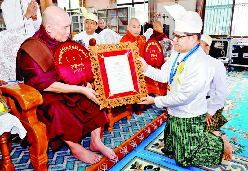 နေပြည်တော်ကောင်စီမှ ကြီးမှူးကျင်းပသည့် ၂၀၂၄ ခုနှစ်၊ သာသနာတော်ဆိုင်ရာ ဘွဲ့တံဆိပ်တော်များ ရရှိကြသည့် ပြည်ထောင်စုနယ်မြေ နေပြည်တော်မှ ဆရာတော်ကြီးများ၊ သီလရှင်ဆရာကြီးများနှင့် လူပုဂ္ဂိုလ်များအား သာသနာတော်ဆိုင်ရာဘွဲ့တံဆိပ်တော်နှင့် အဆောင်အယောင်များ ဆက်ကပ်လှူဒါန်း ချီးမြှင့်အပ်နှင်းပွဲအခမ်းအနားကို ယနေ့ မွန်းလွဲပိုင်းတွင် နေပြည်တော်ကောင်စီရုံး ဇမ္ဗူသီရိခန်းမ၌ ကျင်းပသည်။