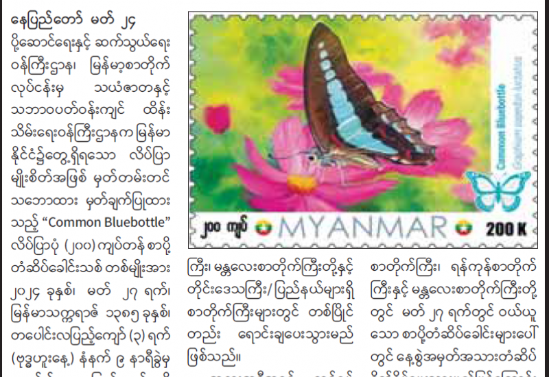 လိပ်ပြာပုံ (၂၀၀) ကျပ်တန် စာပို့တံဆိပ်ခေါင်းသစ်တစ်မျိုး ရောင်းချပေးသွားမည်