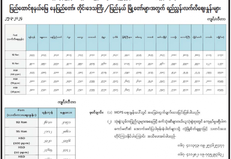 ရန်ကုန်မြို့နှင့် မန္တလေးမြို့အတွက် ရည်ညွှန်းလက်ကားဈေးနှုန်းများနှင့် ပြည်ထောင်စုနယ်မြေ နေပြည်တော်၊ တိုင်းဒေသကြီး/ပြည်နယ် မြို့တော်များအတွက် ရည်ညွှန်းလက်လီဈေးနှုန်းများ
